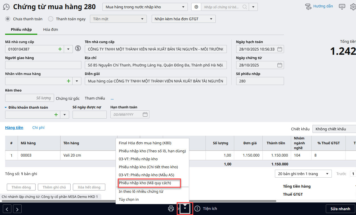 2.4. Nhập mã quy cách trên chứng từ phát sinhBước 1: Tại tab Hàng tiền, trên mỗi dòng hàng có mã hàng theo dõi theo Mã quy cách, ấn Nhập quy cách hoặc ấn nút F6 Bước 2: Nhập chi tiết thông tin mã quy cách sau đó nhấn Đồng ý.