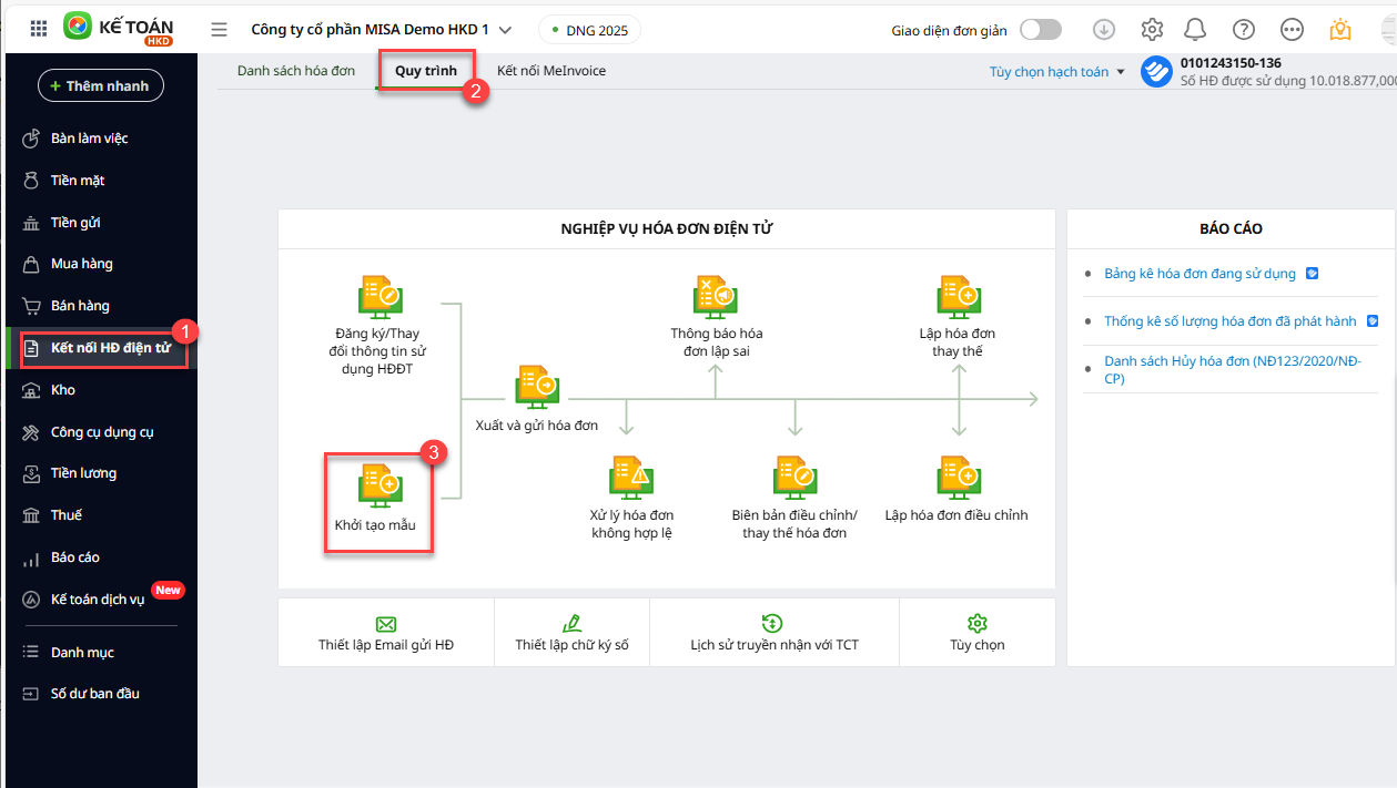 - Trên AMIS Kế toán HKD, anh/chị vào Kết nối HĐ điện tử\Quy trình\Khởi tạo mẫu => Phần mềm sẽ điều hướng sang MeInvoice Web