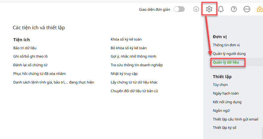 Bước 1: Vào biểu tượng bánh răng (⚙) ở góc phải trên cùng của phần mềm Các tiện ích và thiết lập – chọn Quản lý dữ liệu.