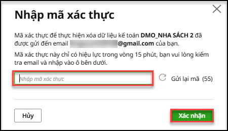 Bước 4: Khi đó chương trình sẽ tự đông gửi mã xác thực để xóa dữ liệu kế toán vào email đăng nhập của người dùng. Thực hiện kiểm tra email, nhập mã xác thực sau đó nhấn Xác nhận.