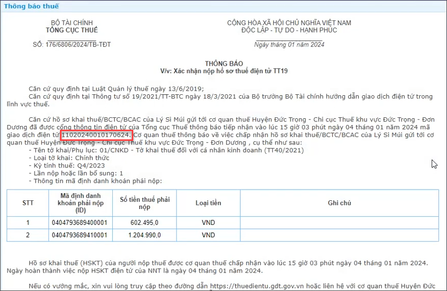 Mã giao dịch điện tử trên tờ khai bổ sung chính là mã của tờ khai thuế lần đầu mà đơn vị đã nộp trước đó, áp dụng với cả thuế GTGT, thuế TNDN…
