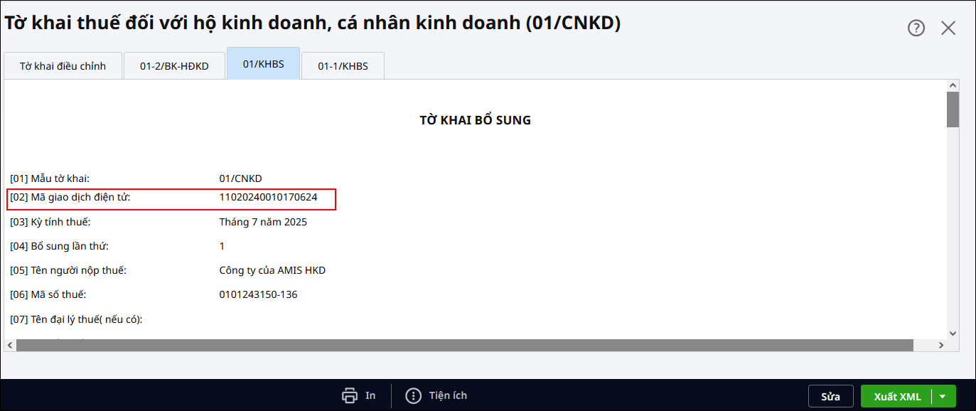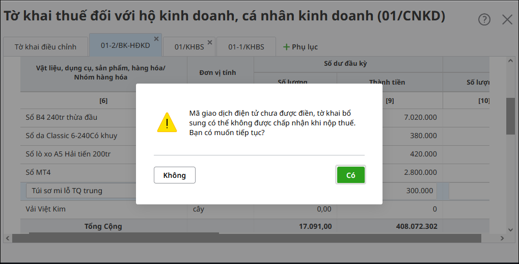 Đơn vị lập tờ khai bổ sung 01/CNKD, khi ấn cất thì báo lỗi “Mã giao dịch điện tử chưa được điền, tờ khai bổ sung có thể không được chấp nhận khi nộp thuế”