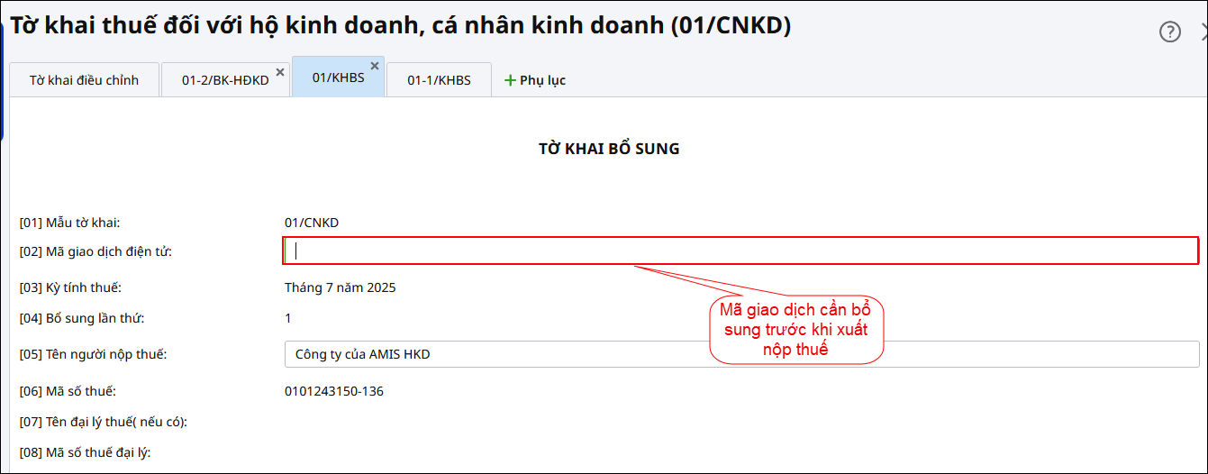 Do trên tờ khai bổ sung, đơn vị đang để trống chỉ tiêu Mã giao dịch điện tử ở phụ lục 01/KHBS