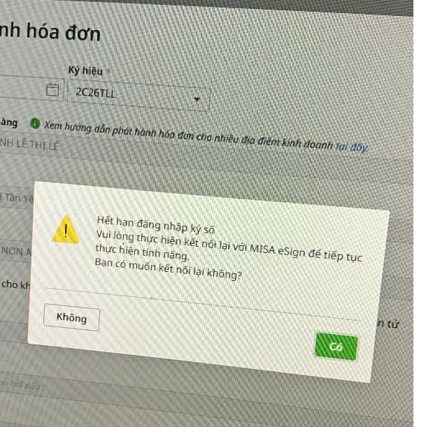 Hoặc chương trình giữ nguyên giao diện phát hành hóa đơn, ký nộp tờ khai thuế,… không trả thông báo gì hoặc trả về thông báo “Hết hạn đăng nhập ký số. Vui lòng thực hiện kết nối lại với MISA eSign để tiếp tục thực hiện tính năng.” như sau: