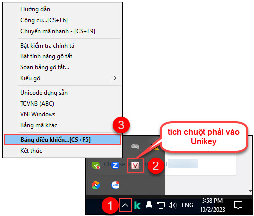 Bước 1: Mở UniKey bằng cách: dưới thanh Taskbar tích vào biểu tượng mũi tên, tích chuột phải vào UniKey, chọn đến Bảng điều khiển.