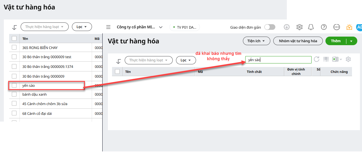 Biểu hiện: Khi thêm mới chứng từ hoặc khi vào phần tìm kiếm trên Danh mục Khách hàng, Nhà cung cấp, hay hàng hóa, dịch vụ,… anh/chị gõ tìm kiếm không tìm thấy thông tin dù trước đó đã khai báo.