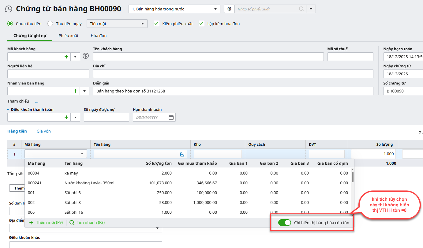 Nguyên nhân 4: Khi thêm/sửa chứng từ bán hàng, nhập kho, xuất kho,...không tìm được do mã VTHH do đang bật tùy chọn: Chỉ hiển thị hàng hóa còn tồn