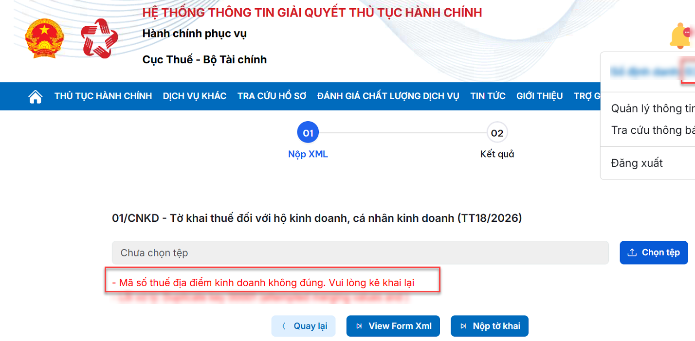 Bài viết hướng dẫn cách xử lý khi nộp tờ khai thuế 01/CNKD theo TT18/2026 trên trang dịch vụ công (DVC) báo lỗi: “Mã số thuế địa điểm kinh doanh không đúng. Vui lòng kê khai lại.”