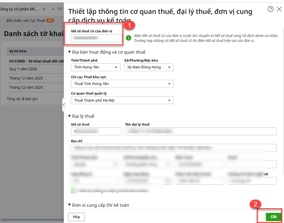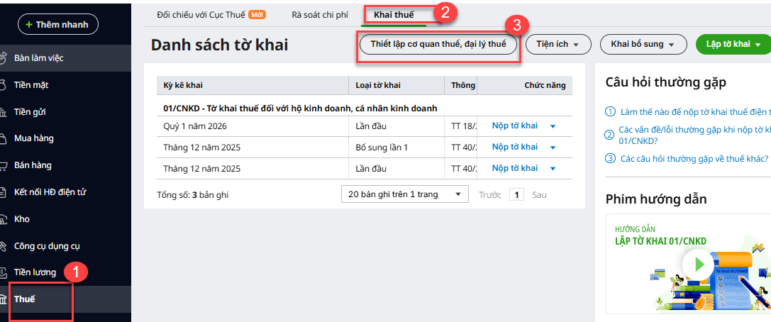 - Vào phân hệ Thuế, tab Khai thuế, nhấn Thiết lập cơ quan thuế, đại lý thuế