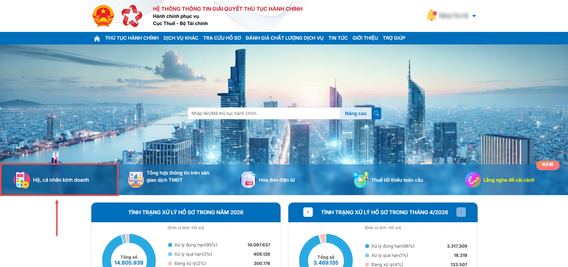 - Tại trang chủ giao diện vừa đăng nhập vào trang, anh/chị chọn Hộ, cá nhân kinh doanh.