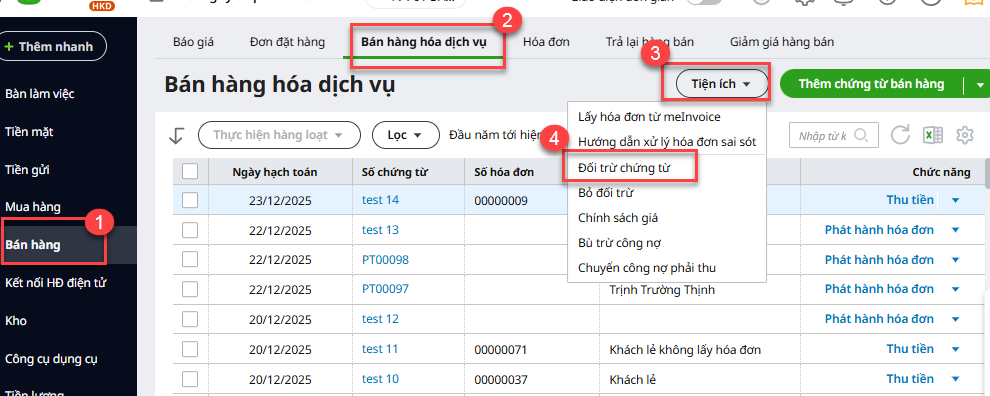 Biểu hiện: Khi vào phân hệ Bán hàng\Bán hàng hóa dịch vụ\ Tiện ích, chọn Đối trừ chứng từ.