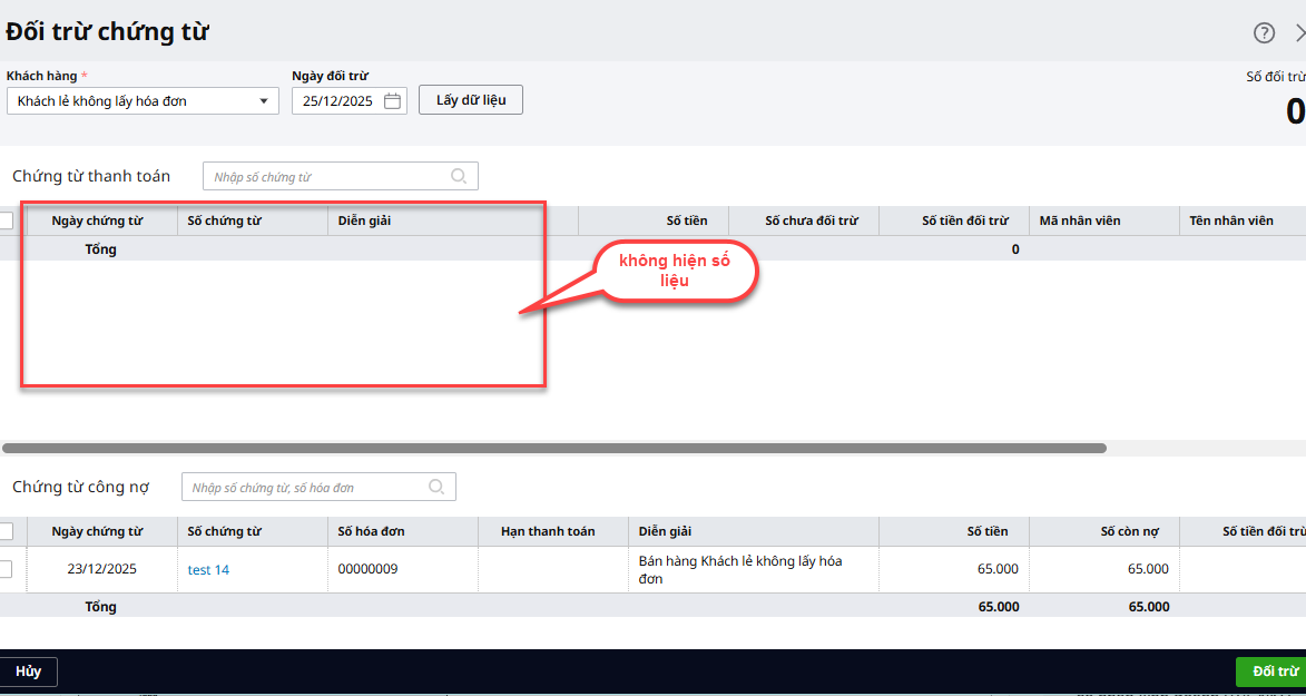 Lựa chọn Khách hàng, Ngày đối trừ, sau đó nhấn Lấy dữ liệu, phần mềm không hiển thị số liệu hoặc hiển thị thiếu số liệu để đối trừ.