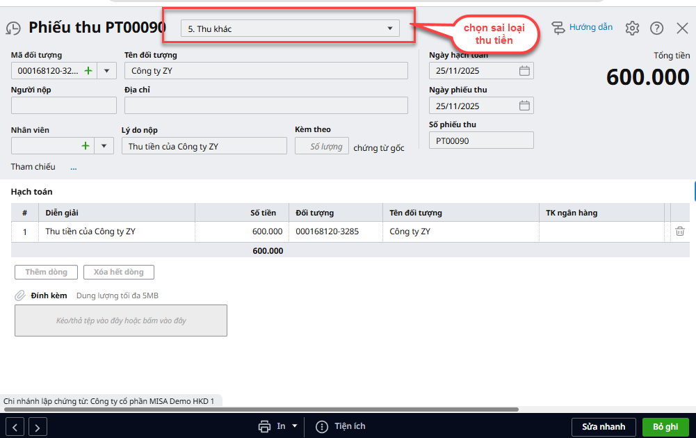 Nguyên nhân 1: Chứng từ thu tiền không chọn đúng loại thu là 1. Thu tiền khách hàng (không theo hóa đơn) Cách kiểm tra: Anh/chị mở lại phiếu thu/ thu tiền gửi xem loại thu đã đúng hay chưa, có đang chọn nhầm sang loại Thu khác, Thu tiền thừa trả nhà cung cấp, Thu hoàn ứng nhân viên, … hay không?