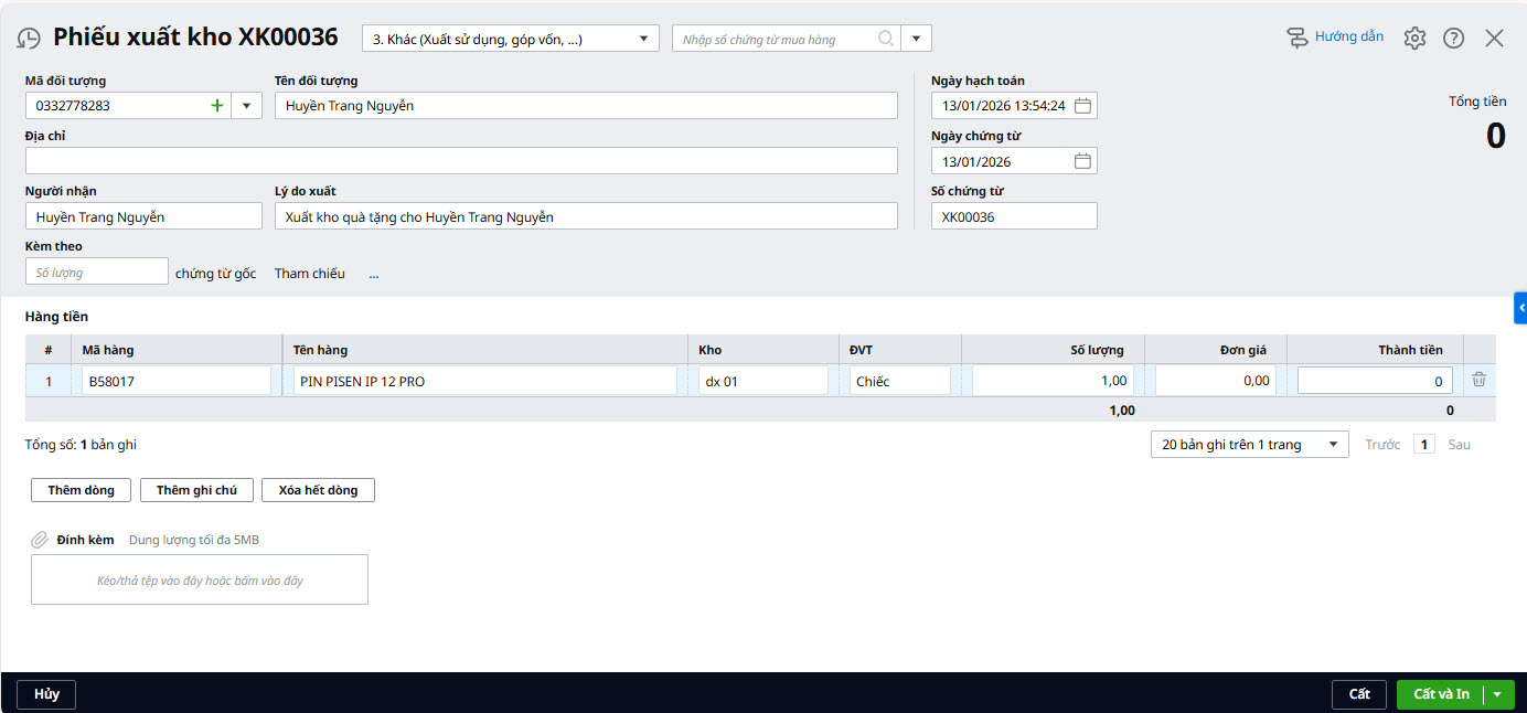 3.1. Lập phiếu xuất khoĐể lập phiếu xuất kho hàng biếu tặng, anh/chị thực hiện như sau: Bước 1: Vào phân hệ Kho\tab Xuất kho, chọn chức năng Thêm xuất kho. Bước 2: Chọn loại phiếu xuất kho là Khác (Xuất sử dụng, góp vốn …). Bước 3: Khai báo thông tin chứng từ: Mã đối tượng, Lý do xuất, Mã hàng, Kho, Số lượng,… Bước 4: Sau đó nhấn Cất.