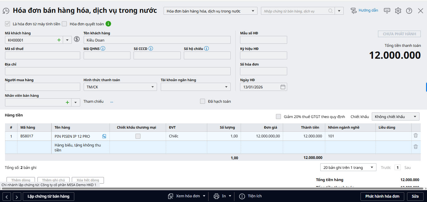 3.2. Lập và xuất hóa đơn điện tửĐể lập và xuất hóa đơn biếu tặng, anh/chị thực hiện như sau: Bước 1: Vào phân hệ Bán hàng\tab Hoá đơn, nhấn Thêm hóa đơn Bước 2: Chọn loại Hóa đơn bán hàng hóa, dịch vụ trong nước và khai báo các thông tin chung của hóa đơn. (Lưu ý: Hoá đơn chỉ lấy được loại đối tượng là Khách hàng, vì vậy nếu đối tượng cần chọn thuộc loại là Nhân viên => thì vào Danh mục/Đối tượng/Nhân viên, mở mã nhân viên đó lên và tích vào ô “Là khách hàng”/nhấn Cất). Bước 3: Tại tab Hàng tiền, khai báo thông tin hàng hóa xuất biếu tặng, sử dụng nội bộ. Tích Thêm ghi chú để ghi thêm dòng ghi chú: Hàng biếu, tặng không thu tiền. Bước 4: Sau khi khai báo xong anh/chị nhấn Cất và Phát hành hóa đơn.