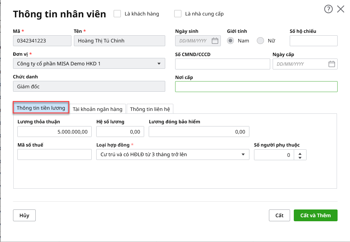 Bước 3: Khai báo lương thỏa thuận hoặc hệ số lương của nhân viên trong danh mục: