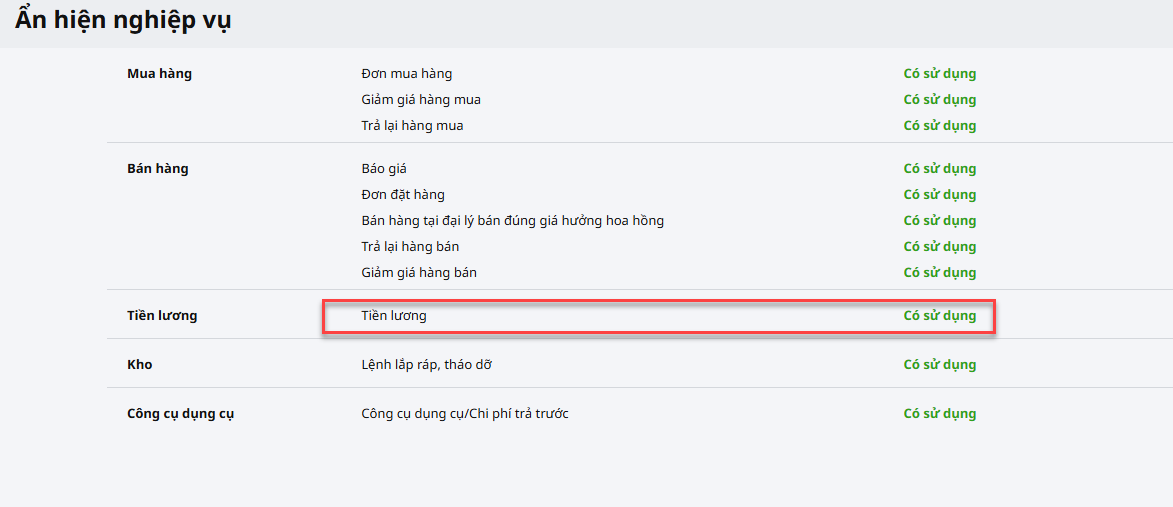 Lưu ý: Để hiển thị phân hệ Tiền lương, anh/chị cần tích chọn Có sử dụng nghiệp vụ Tiền lương trên Các tiện ích và Thiết lập/ Tùy chọn/ Ẩn hiện nghiệp vụ.