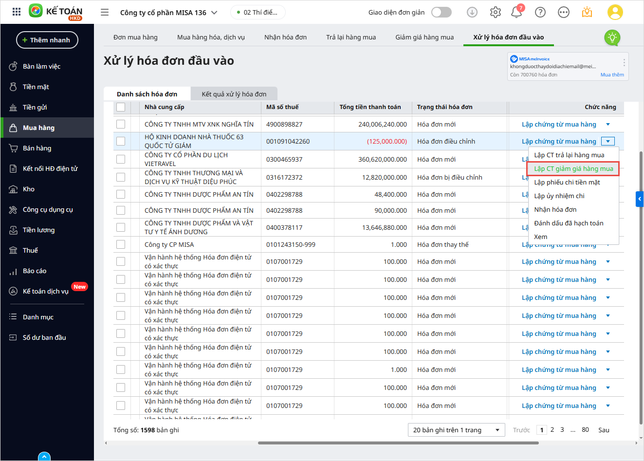Lập chứng từ giảm giá hàng mua, trả lại hàng mua từ Xử lý hóa đơn đầu vào