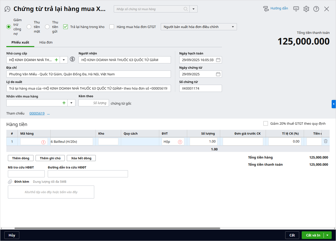 2.2. Lập chứng từ trả lại hàng mua từ hóa đơn đầu vào