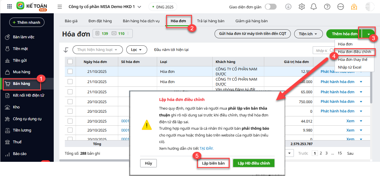 - Vào phân hệ Bán hàng, tab Hóa đơn, nhấn biếu tượng mũi tên (▼) cạnh Thêm hóa đơn\Hóa đơn điều chỉnh\ Lập biên bản.