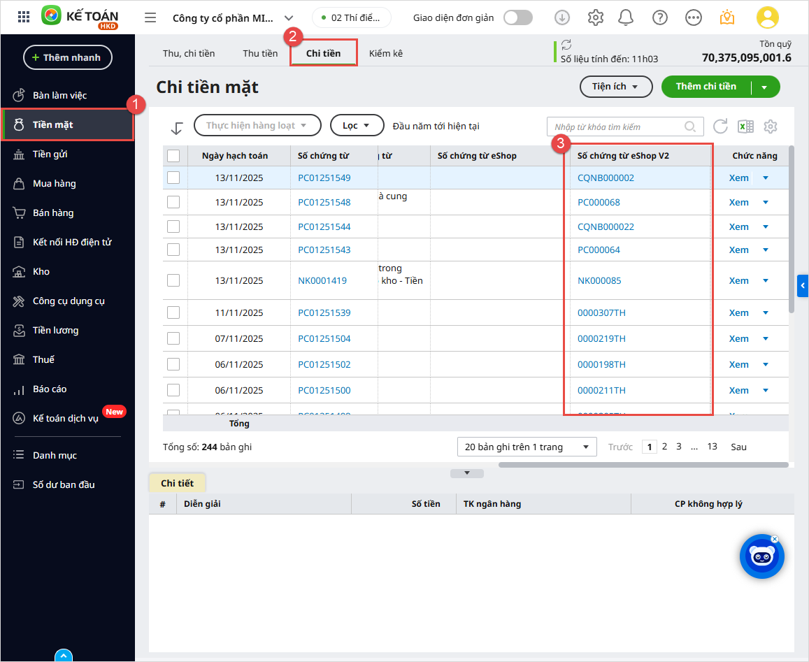 Vào phân hệ Tiền mặt\tab Chi tiền, các chứng từ lấy về sẽ được hiển thị ở cột Số chứng từ eShopV2.
