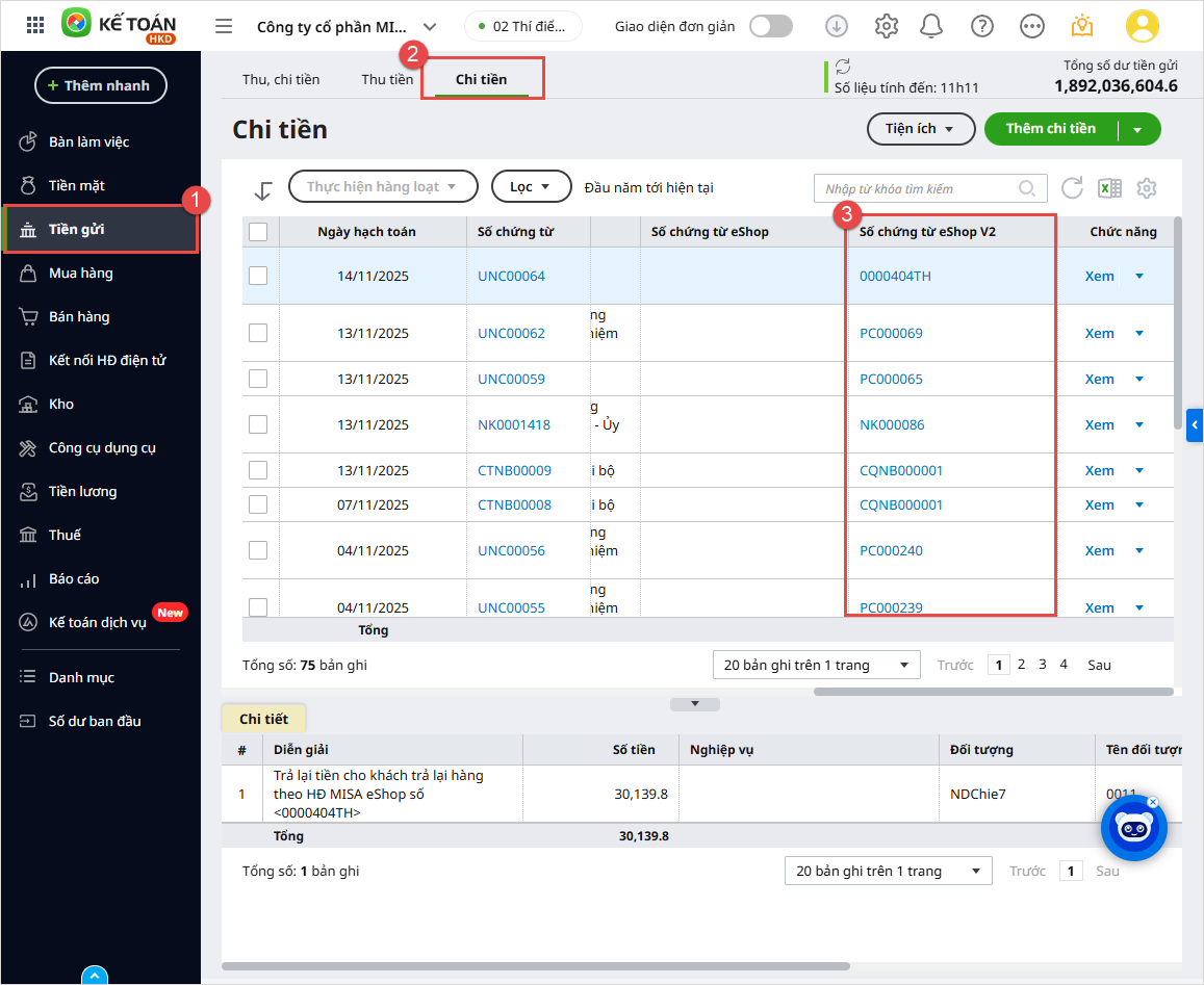 Vào phân hệ Tiền gửi\tab Chi tiền, các chứng từ lấy về sẽ được hiển thị ở cột Số chứng từ eShopV2.