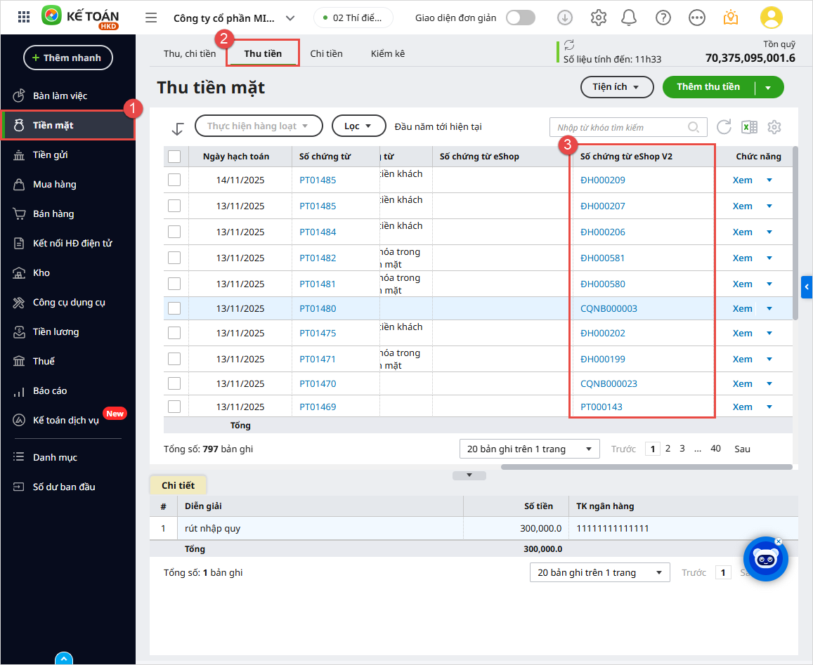 Vào phân hệ Tiền mặt\tab Thu tiền, các chứng từ lấy về sẽ được hiển thị ở cột Số chứng từ eShopV2.
