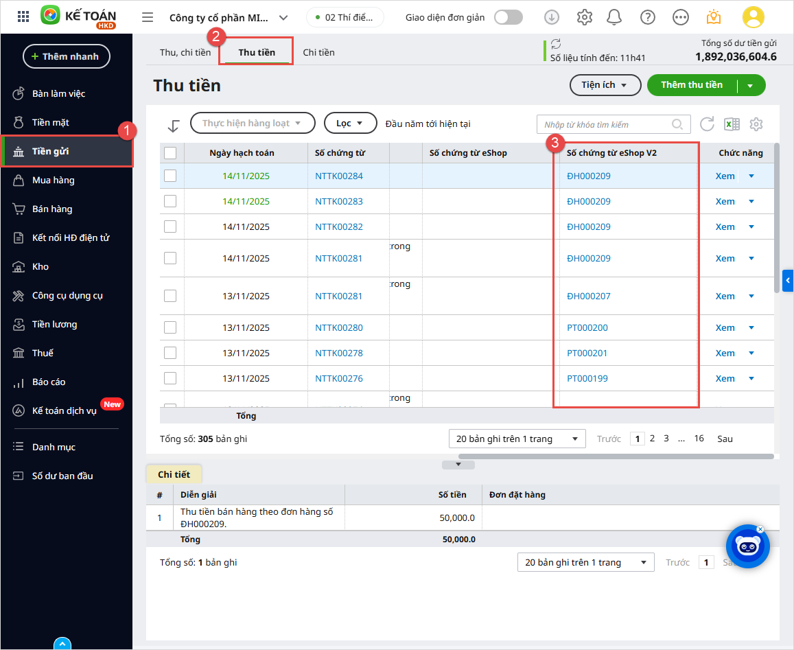 Vào phân hệ Tiền gửi\tab Thu tiền, các chứng từ lấy về sẽ được hiển thị ở cột Số chứng từ eShopV2.