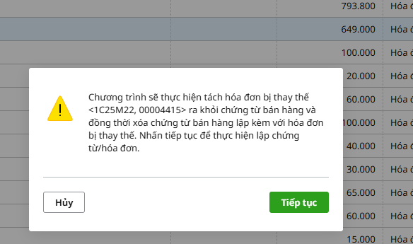 Lưu ý: Khi lập chứng từ bán hàng cho hóa đơn thay thế lấy từ meInvoice thì hóa đơn gốc đang có ở trên phần mềm AMIS Kế toán HKD sẽ tự động cập nhật trạng thái từ hóa đơn gốc về hóa đơn bị thay thế. Nếu hóa đơn gốc mà bị thay thế này lập kèm với chứng từ bán hàng thì phần mềm tự động xử lý bằng cách tách hóa đơn bị thay thế ra khỏi chứng từ bán hàng cũ và xóa chứng từ bán hàng cũ đi để tránh hạch toán 2 lần.