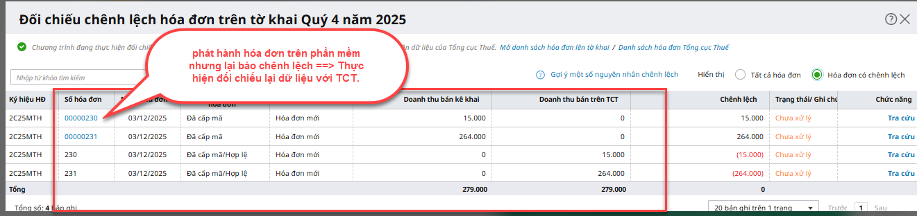 Nguyên nhân 2: Do có phát sinh hóa đơn thay thế/điều chỉnh khác kỳ, đã được kê khai ở kỳ hóa đơn gốc nên khi đối chiếu với TCT sẽ bị chênh lệch Biểu hiện: Khi thực hiện đối chiếu dữ liệu tờ khai với TCT, số liệu cột Doanh thu bán kê khai sẽ lấy theo các hóa đơn được kê lên tờ khai này không quan trọng phát sinh cùng kỳ hay khác kỳ khai thuế còn số liệu cột Doanh thu bán trên TCT sẽ lấy theo dữ liệu hóa đơn có ngày hóa đơn phát sinh trong kỳ khai thuế. Vì vậy nếu hóa đơn thay thế/điều chỉnh khác kỳ được kê khai vào kỳ hóa đơn gốc thì: