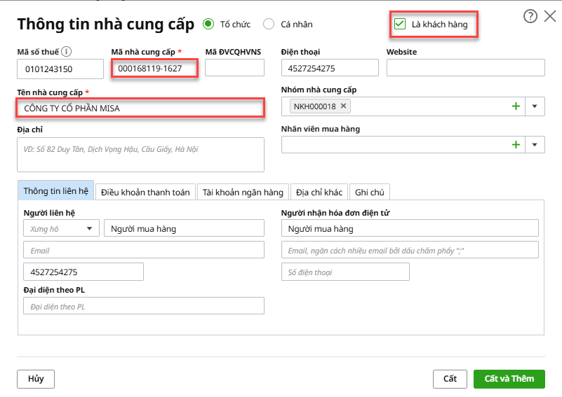 - Tích chọn Là khách hàng, nếu đối tượng khai báo vừa là nhà cung cấp, vừa là khách hàng. Khi đó, thông tin đối tượng sau khi cất giữ sẽ được chương trình tự động lưu trên cả danh sách nhà cung cấp lẫn danh sách khách hàng.