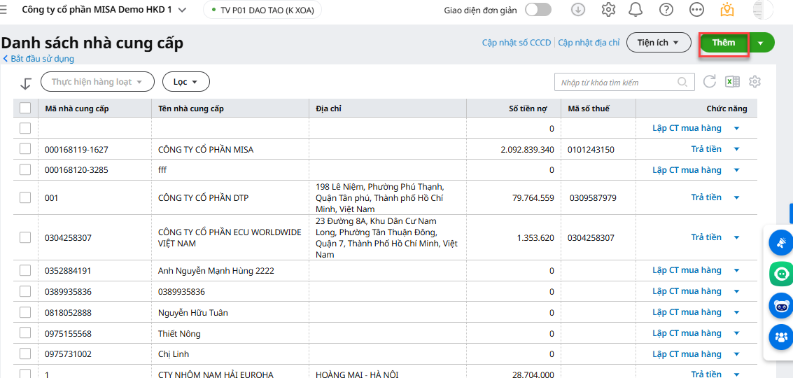 Bước 4: Nhấn Cất. Nếu muốn vừa lưu nhà cung cấp đang khai báo và đồng thời thêm mới đối tượng khác, chọn Cất và Thêm.