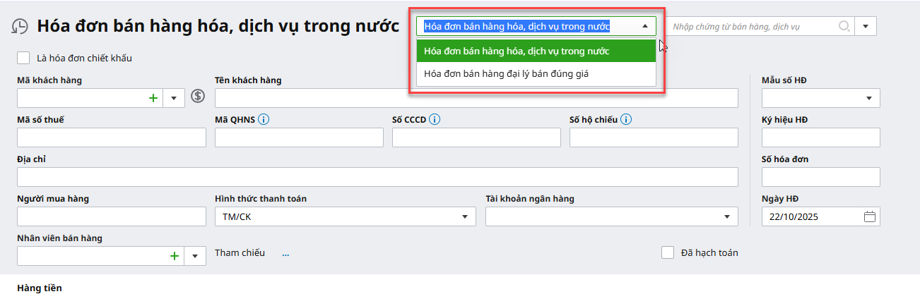 Bước 2: Lựa chọn lập hoá đơn cho hình thức bán hàng nào: Bán hàng hoá, dịch vụ trong nước, Bán hàng đại lý bán đúng giá: