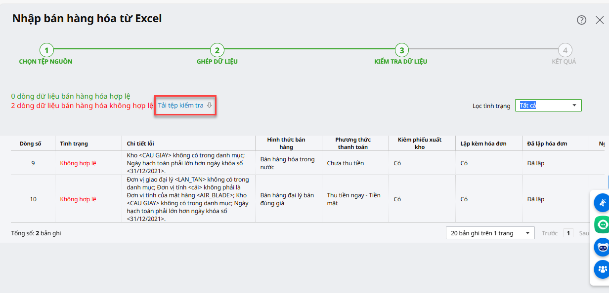- Trường hợp có dòng không hợp lệ, anh/chị ấn Tải tệp kiểm tra về máy chỉnh sửa lại và thực hiện nhập khẩu lại.