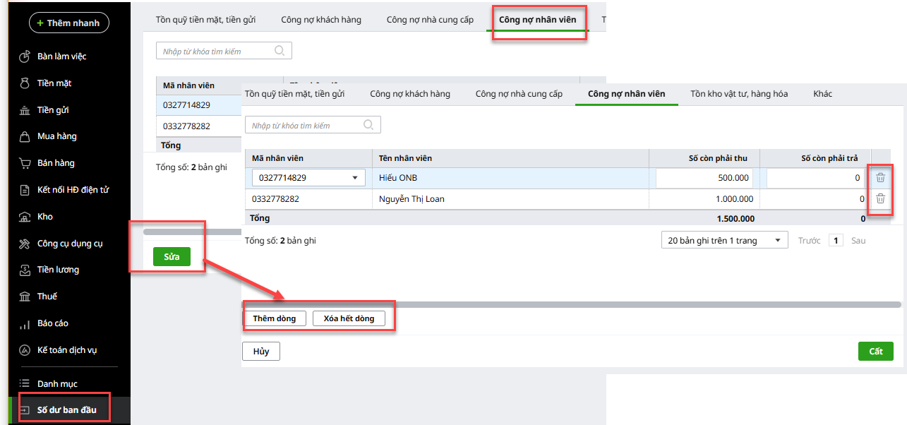 Lưu ý: Nếu muốn sửa lại số dư thì nhấn chức năng Sửa, muốn nhập thêm số dư nhân viên khác thì nhấn Sửa ->Thêm dòng, muốn xóa số dư của một số nhân viên thì nhấn Sửa ->tại dòng công nợ nhân viên muốn xóa nhấn vào biểu tượng thùng rác (🗑️) để xóa và nếu muốn xóa hết tất cả số dư đang có để nhập lại thì nhấn Sửa -> Xóa hết dòng.