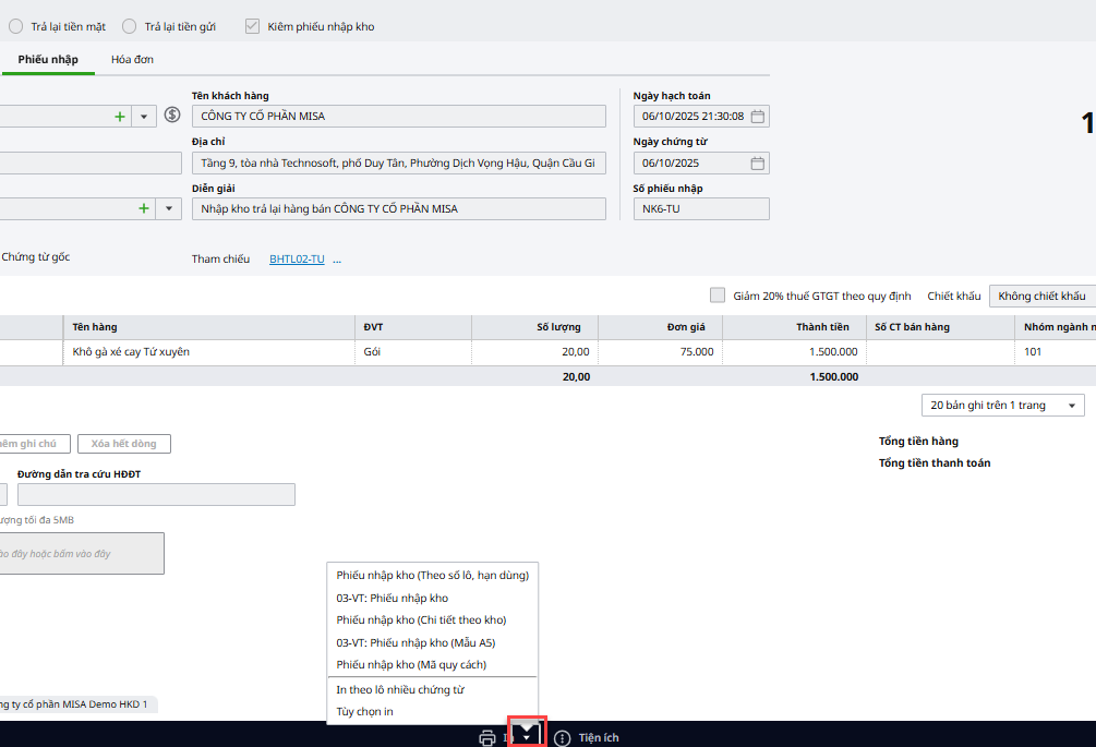 Bước 3: Nhấn biểu tượng mũi tên (▼) cạnh nút In, sau đó chọn mẫu phiếu nhập kho cần in.