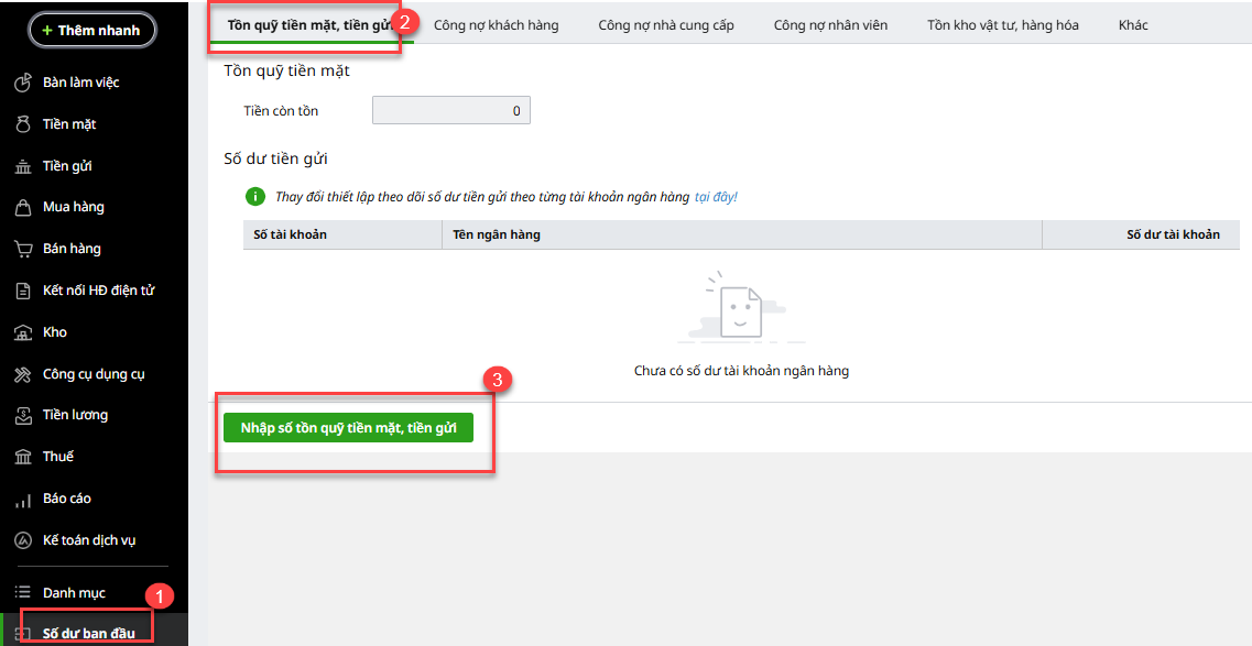 5. Nhập số dư tồn quỹ tiền mặt, tiền gửi