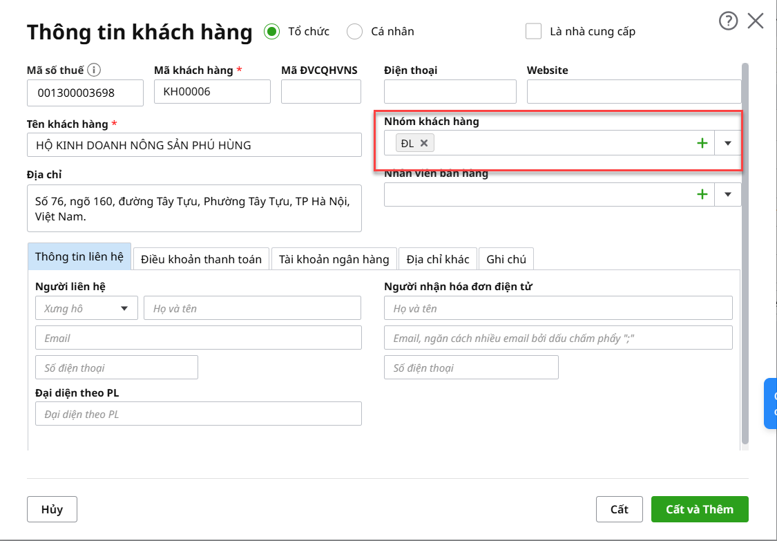 Bước 2: Khai báo thông tin về Nhóm khách hàng, nhà cung cấp cần thêm, với các thông tin có ký hiệu sao (*) anh/chị sẽ bắt buộc phải khai báo. Sau khi khai báo xong, nhấn Cất hoặc Cất và Thêm.