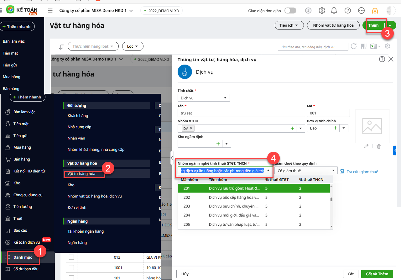 - Cách 1: Khai báo tại mục Nhóm ngành nghề tính thuế GTGT, TNCN tương ứng cho từng vật tư hàng hóa khi thêm mới trên menu Danh mục\Vật tư hàng hóa\ Vật tư hàng hóa