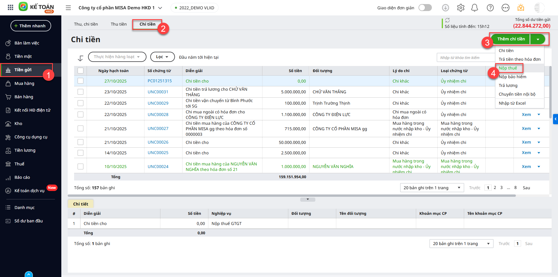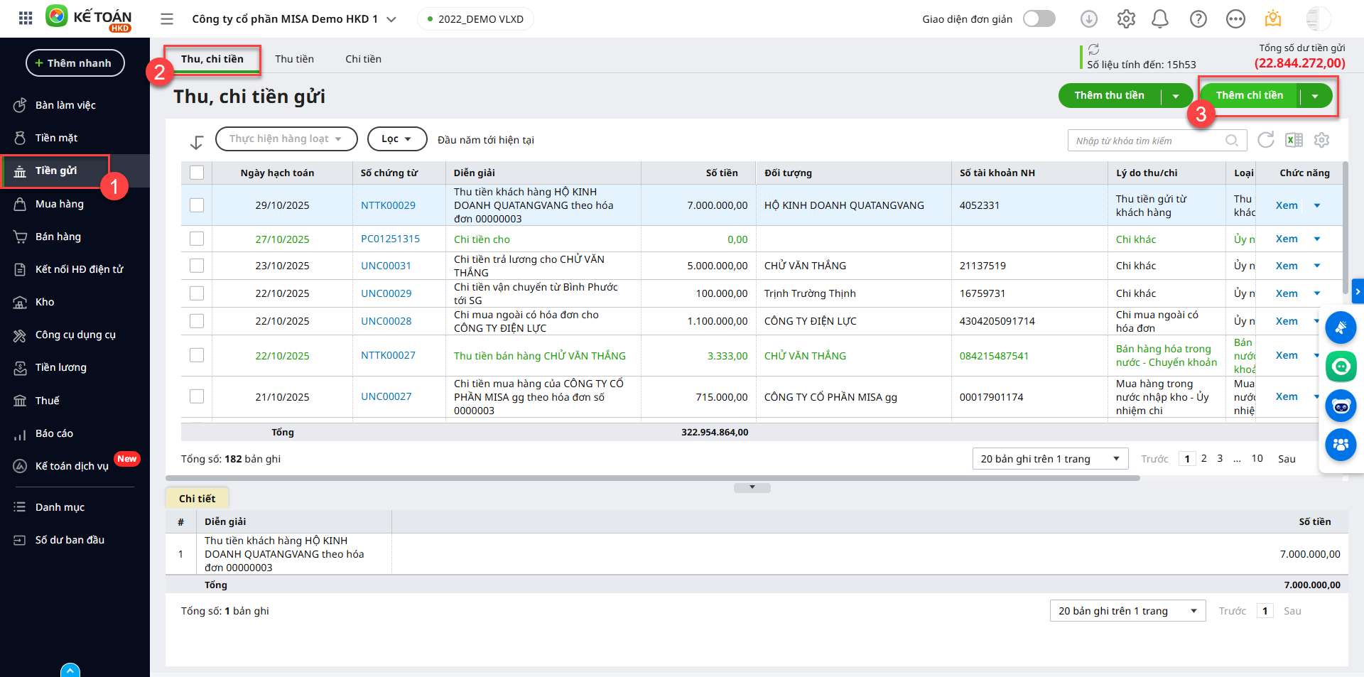 Bước 1: Vào phân hệ Tiền gửi\tab Thu, chi tiền, chọn Thêm chi tiền