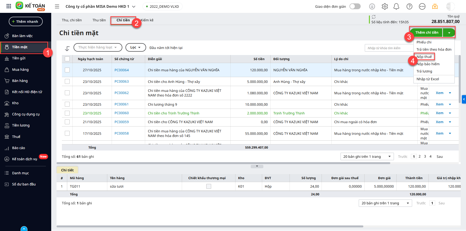 Hoặc vào phân hệ Tiền mặt\tab Chi tiền\Thêm chi tiền\Nộp thuế: