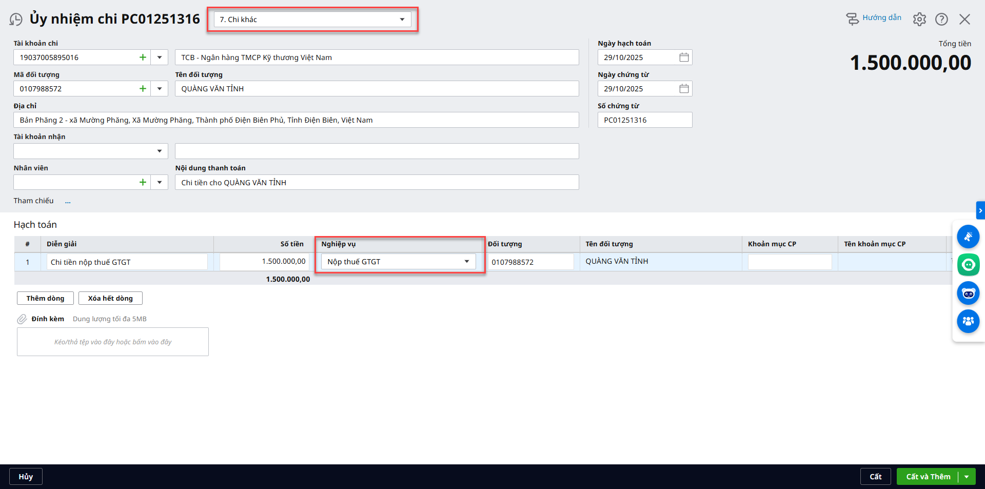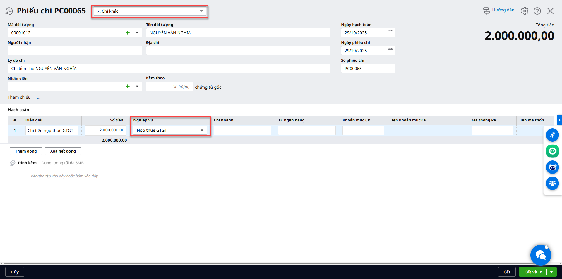 Cách 2: Lập phiếu chi khác và chọn nghiệp vụ Nộp thuế