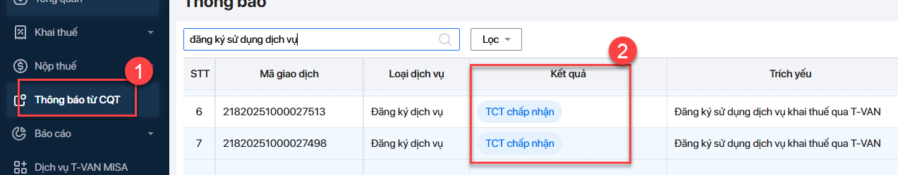 Sau khi ký và gửi tờ khai xong, CQT trả thông báo về phần mềm tại phần Thông báo từ CQT (thường là sau 5 – 15 phút). Anh/chị kiểm tra kết quả, nếu là TCT chấp nhận thì có nghĩa anh/chị đã đăng ký thành công và đã có thể nộp tờ khai thuế qua dịch vụ mTax.