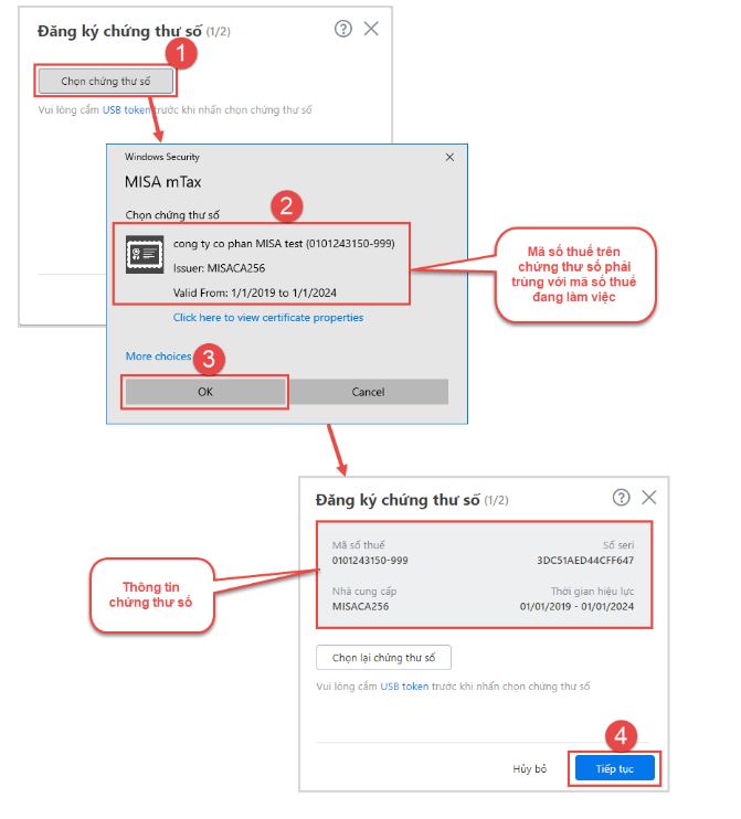 • Nếu đơn vị dùng USB Token : đơn vị cắm chữ ký số USB Token vào máy tính, nhấn Chọn chứng thư số, phần mềm hiển thị danh sách chữ ký số, chọn dòng chữ ký số đúng, nhấn OK, nhấn Tiếp tục.