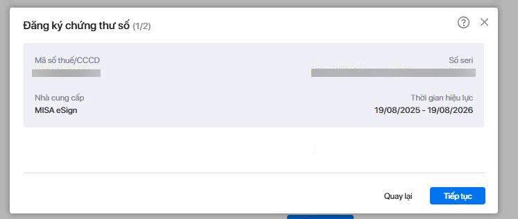 • Nếu đơn vị dùng chữ ký số từ xa MISA eSign: phần mềm hiển thị chứng thư số đã thiết lập ở bước 2.