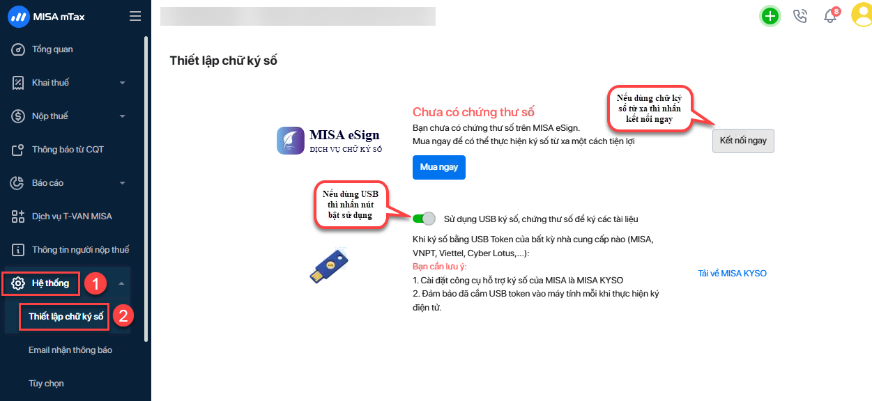 Lưu ý: Nếu dùng USB Token, anh/chị nhấn Tải về MISA KYSO để cài đặt công cụ hỗ trợ ký.