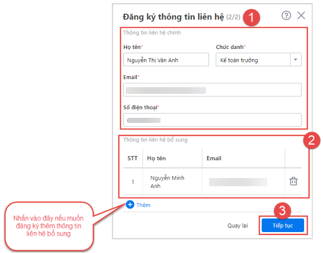 • Thông tin liên hệ bổ sung: là thông tin đăng ký thêm để nhận thông báo từ cơ quan thuế (không bắt buộc và không giới hạn số lượng đăng ký)