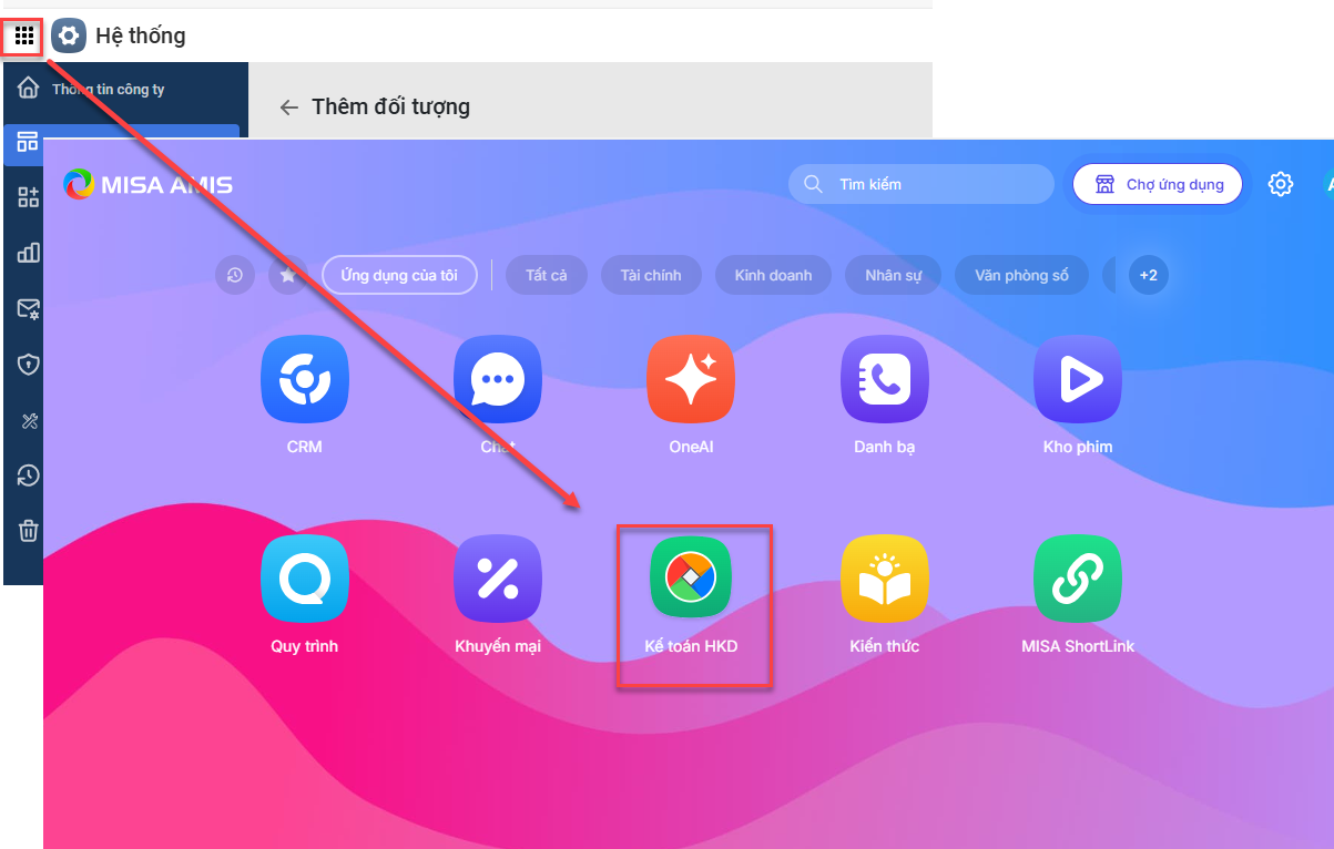2.2. Thực hiện lấy người dùng từ AMIS Platform và chọn vai trò cho người dùngBước 1: Nhấn vào biểu tượng hình chín ô vuông ở góc trên bên trái màn hình, chọn ứng dụng Kế toán HKD để vào hệ thống AMIS Kế toán Hộ kinh doanh