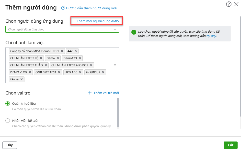 Bước 5: Chương trình sẽ tự động lấy lên các thông tin như Email, số điện thoại của người dùng đã được khai báo trên AMIS Platform ở bước 1. Sau khi chọn người dùng xong, tích chọn vai trò kế toán cho người dùng và nhấn Cất để lưu lại thông tin.