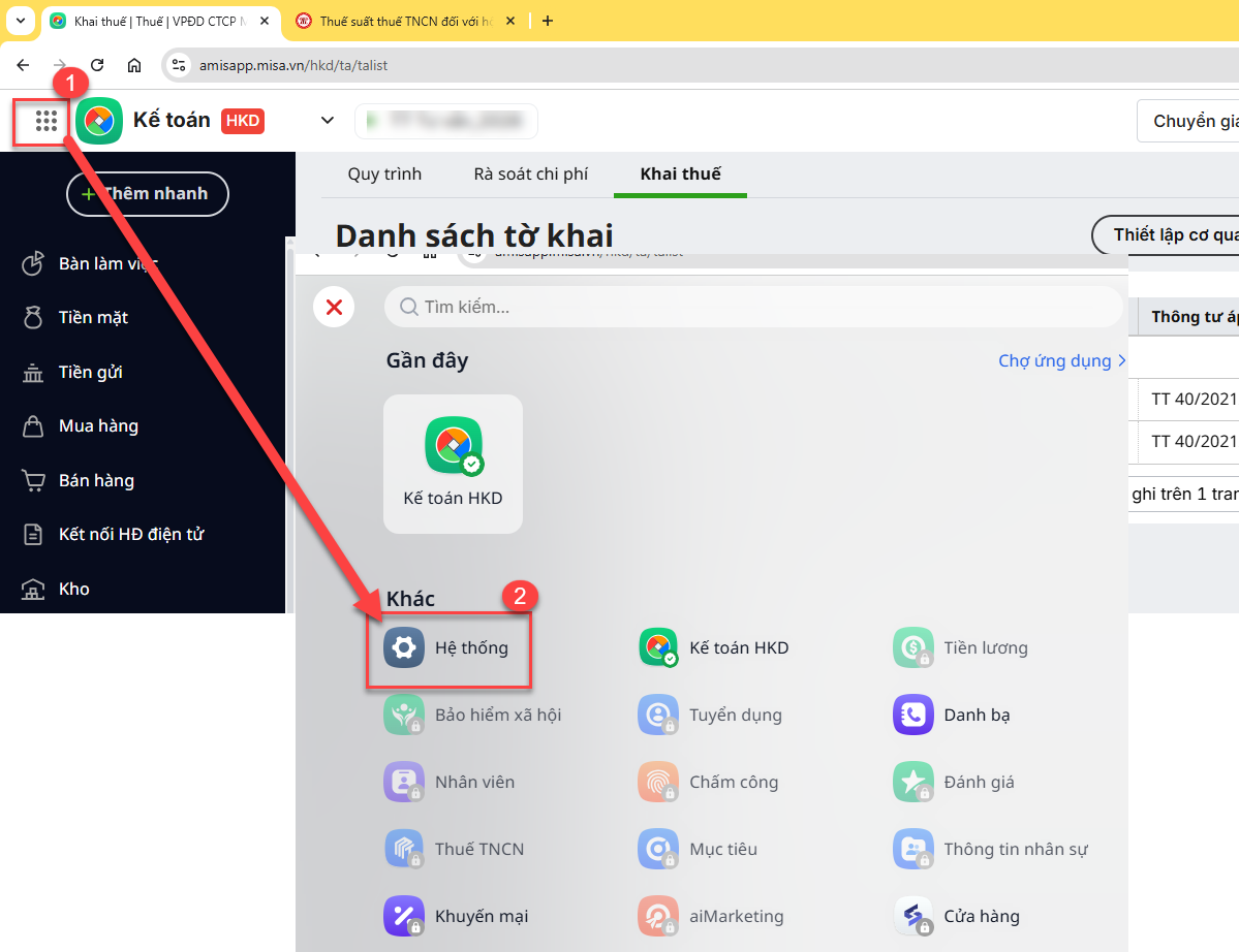Nếu đang ở giao diện Kế toán HKD, anh/chị tích vào biểu tượng 9 ô vuông ở góc trái trên cùng để chọn sang ứng dụng Hệ thống.